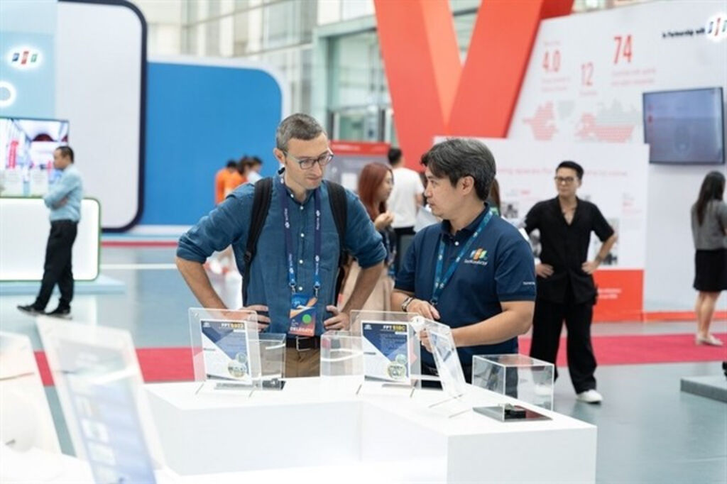 | Le stand de FPT présentant des puces semi-conductrices lors d'une exposition au Vietnam. |