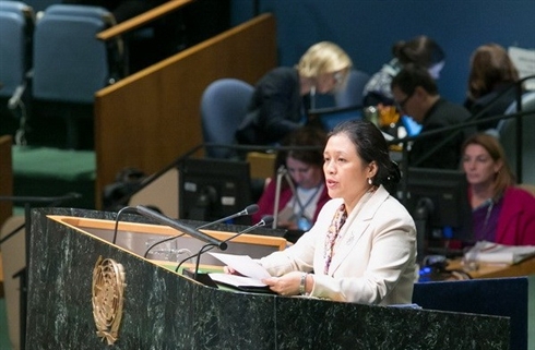 | La chef de la Mission permanente du Vietnam auprès de l'ONU, l'ambassadrice Nguyên Phuong Nga, prend la parole lors d'une réunion de cette organisation à New York. |