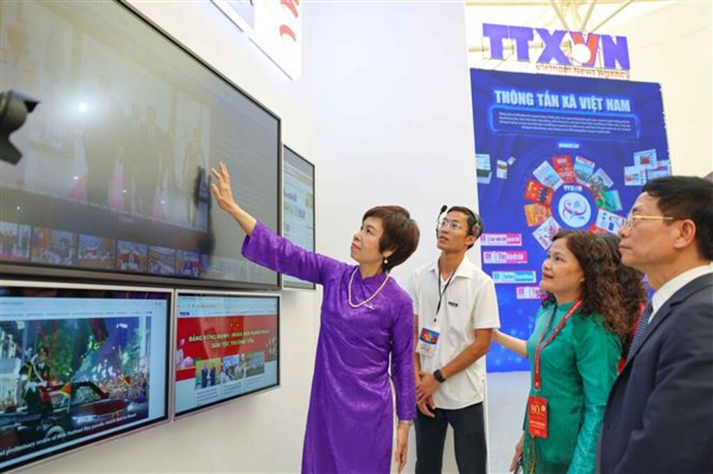 | Le ministre des Sciences et Technologies, Nguyên Manh Hùng (3e à droite), et la directrice générale de l'Agence Vietnamienne d'Information (VNA), Vu Viêt Trang (centre), visitent l'espace d'exposition de l'agence. |
