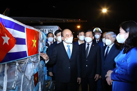 | Le président Nguyên Xuân Phuc lors de la cérémonie de réception de vaccins contre le COVID-19, en marge de sa visite officielle à Cuba et de sa participation à la 76e session de l’Assemblée générale de l’ONU. |
