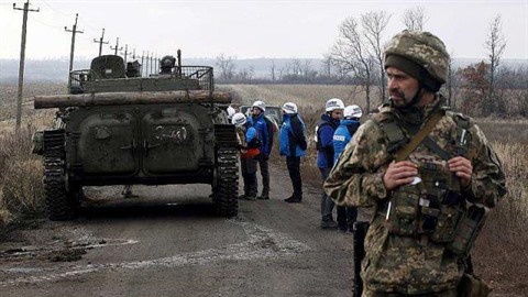 | Des observateurs de l’Organisation pour la sécurité et la coopération en Europe (OSCE) surveillent le retrait des forces ukrainiennes près du village de Bogdanivka dans la région de Donetsk. |