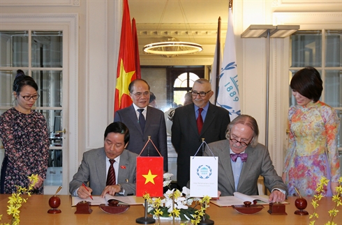 | Cérémonie de signature d'une convention entre l'AN du Vietnam et l'UIP, le 16 mars à Genève. |