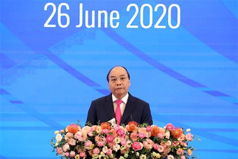 | Le Premier ministre Nguyên Xuân Phuc, qui est également président de l'ASEAN 2020, prononce son discours d'ouverture lors du 36e Sommet de l'ASEAN. |