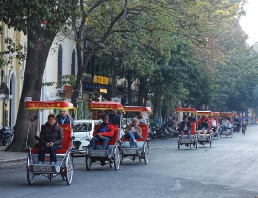 | Des touristes étrangers visitent le centre-ville en cyclo-pousse, à Hanoï. |