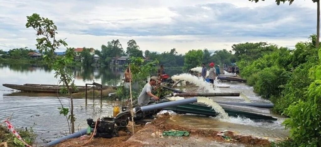 | La coopérative agricole de Phu Hô, dans la ville de Huê (Centre), a mobilisé du personnel et des pompes pour drainer les eaux de crue. |