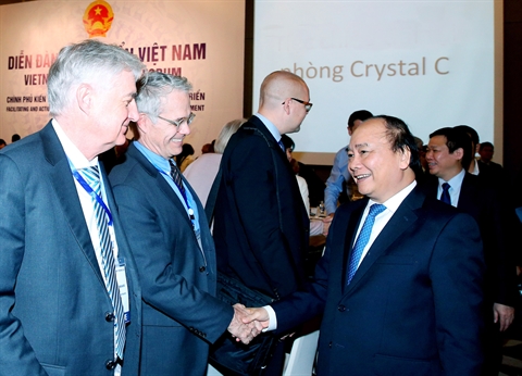 | Le Premier ministre Nguyên Xuân Phuc (droite) lors du Forum de développement du Vietnam 2016, le 9 décembre à Hanoï. |