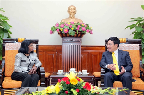 | Le vice-Premier ministre et ministre des Affaires étrangères Pham Binh Minh et la secrétaire générale adjointe des Nations unies, Mme Ameerah Haq, le 26 mai à Hanoi. |