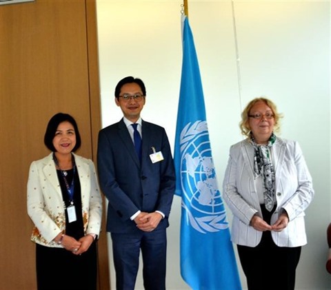 | L’assistant du ministre des Affaires étrangères Dô Hung Viêt (centre) avec la directrice générale de l’Office des Nations unies à Genève, Tatiana Valovaya (droite). |
