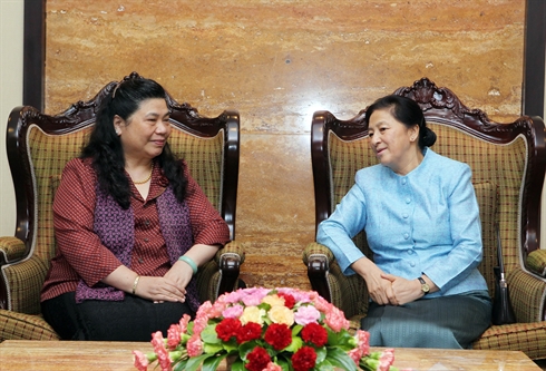 | La présidente de l'Assemblée nationale lao, Pany Yathotou (droite), et la vice-présidente de l'Assemblée nationale vietnamienne, Tong Thi Phong, le 18 septembre à Vientiane. |