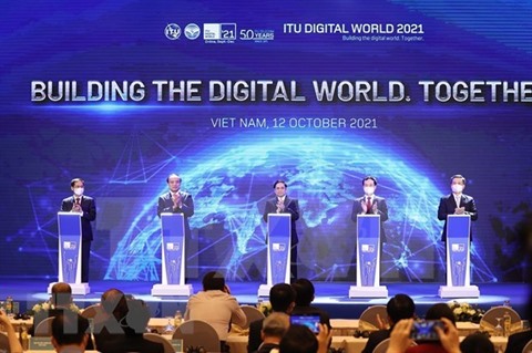 | Le Premier ministre Pham Minh Chinh (centre) à la cérémonie d'inauguration du Monde numérique de l'UIT. |