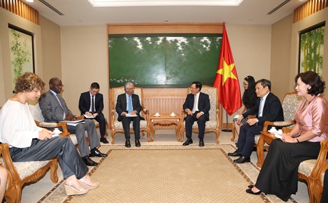 | Séance de travail du vice-Premier ministre Pham Binh Minh avec le coordinateur résident de l'ONU, Kamal Malhotra, et le directeur national de la BM au Vietnam, Ousmane Dione. |