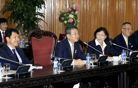 | Shosuke Mori (3e à droite), président de la Kankeiren, lors du rencontre avec le vice-Premier ministre Vuong Dinh Huê, le 12 septembre à Hanoï. |