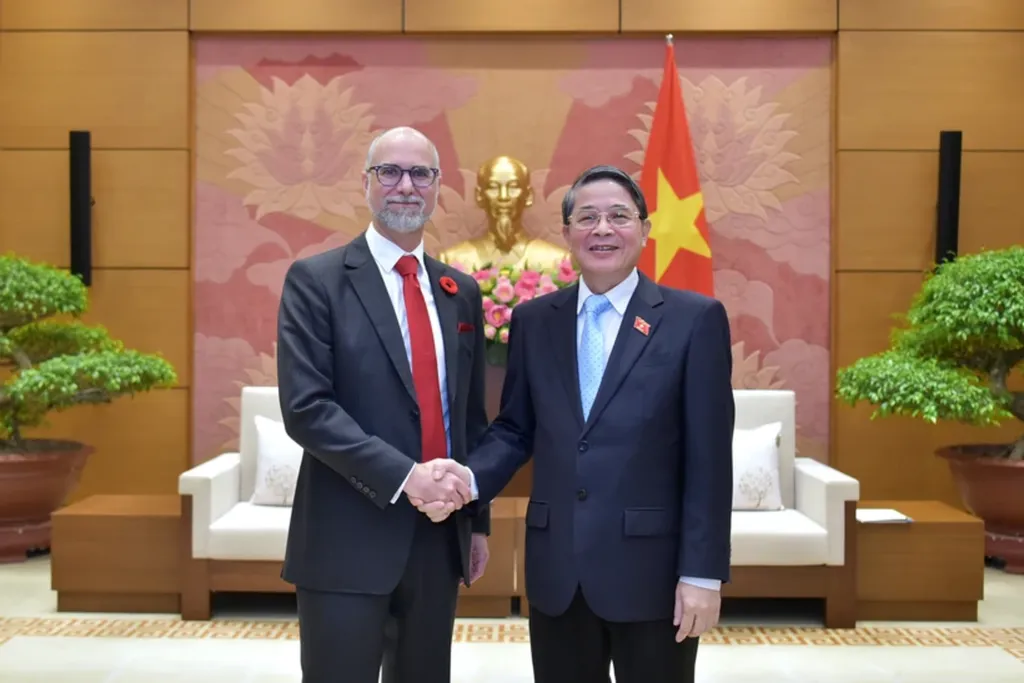 | Le vice-président de l'Assemblée nationale Nguyên Duc Hai (droite) et l'ambassadeur du Canada au Vietnam, Perry Shawn Steil. |