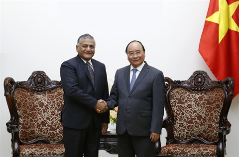 | Le Premier ministre Nguyên Xuân Phuc (droite) et le secrétaire d'État indien aux Affaires étrangères, Vijay Kumar Singh. |