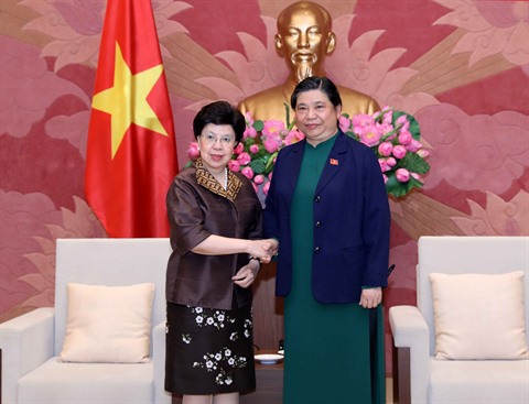 | La vice-présidente permanente de l’Assemblée nationale du Vietnam, Tong Thi Phong (droite) et la directrice générale de l’OMS, Margaret Chan, le 10 avril à Hanoï. |
