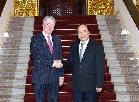 | Le Premier ministre vietnamien Nguyên Xuân Phuc (droite) reçoit le ministre néo-zélandais de l'Agriculture, de la Biosécurité et de la Sécurité alimentaire, Damien O’Connor. |