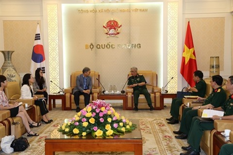 | Le vice-ministre vietnamien de la Défense, Nguyên Chi Vinh (droite) et le nouveau directeur national de l’Agence coréenne de coopération internationale au Vietnam, Cho Han-Deo. |