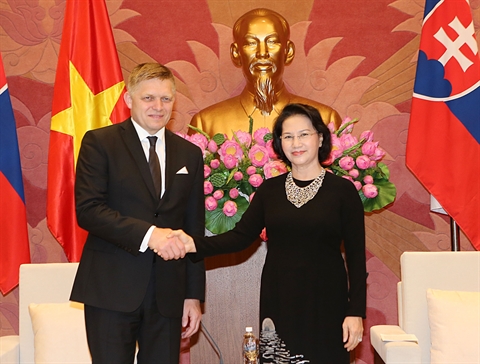 | La présidente de l’Assemblée nationale vietnamienne Nguyên Thi Kim Ngân et le Premier ministre slovaque Robert Fico, le 18 juillet à Hanoi. |
