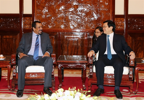 | Le président du Vietnam, Truong Tân Sang (droite), et l’ambassadeur du Koweït, Hamad Saleh Al-Jutaili, le 6 octobre à Hanoi |
