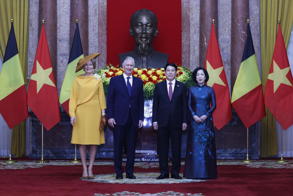 | De gauche à droite, la reine Mathilde de Belgique, le roi Philippe, le président vietnamien Luong Cuong et son épouse Nguyên Thi Minh Nguyêt. |
