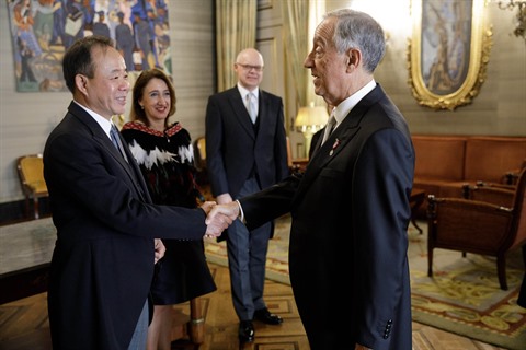| L'ambassadeur du Vietnam au Portugal résidant en France, Nguyên Thiêp (gauche), et le président portugais Marcelo Rebelo de Sousa. |