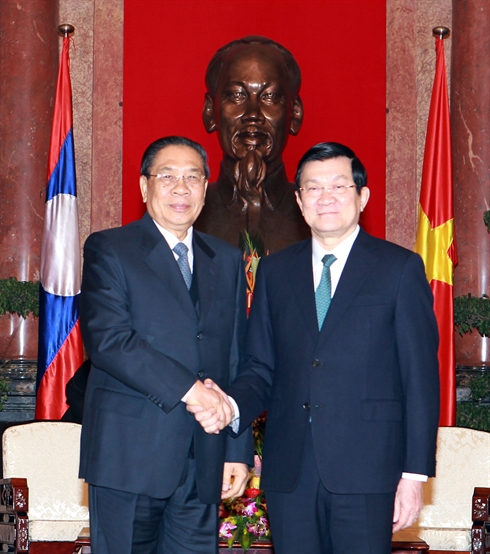 | Le président de la République, Truong Tân Sang (droite), et le secrétaire général du Parti populaire révolutionnaire du Laos et président du Laos, Choummaly Sayasone, le 26 décembre à Hanoi. |