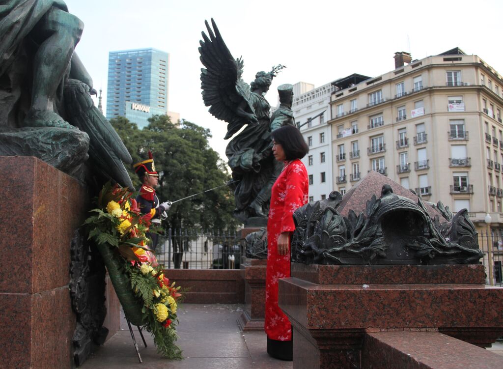 | L'ambassadrice Ngô Minh Nguyêt dépose une gerbe de fleurs au Monument dédié au général San Martín à Buenos Aires. |