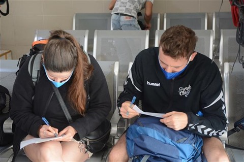 | Des touristes étrangers remplissent le formulaire de déclaration médicale à la gare de Dà Nang (Centre). |