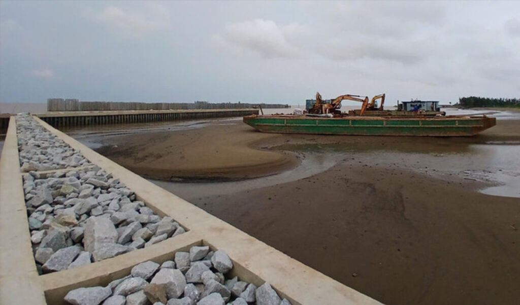 | Construction d'un brise-lames dans le bourg de Vinh Châu, province de Soc Trang (Sud). |