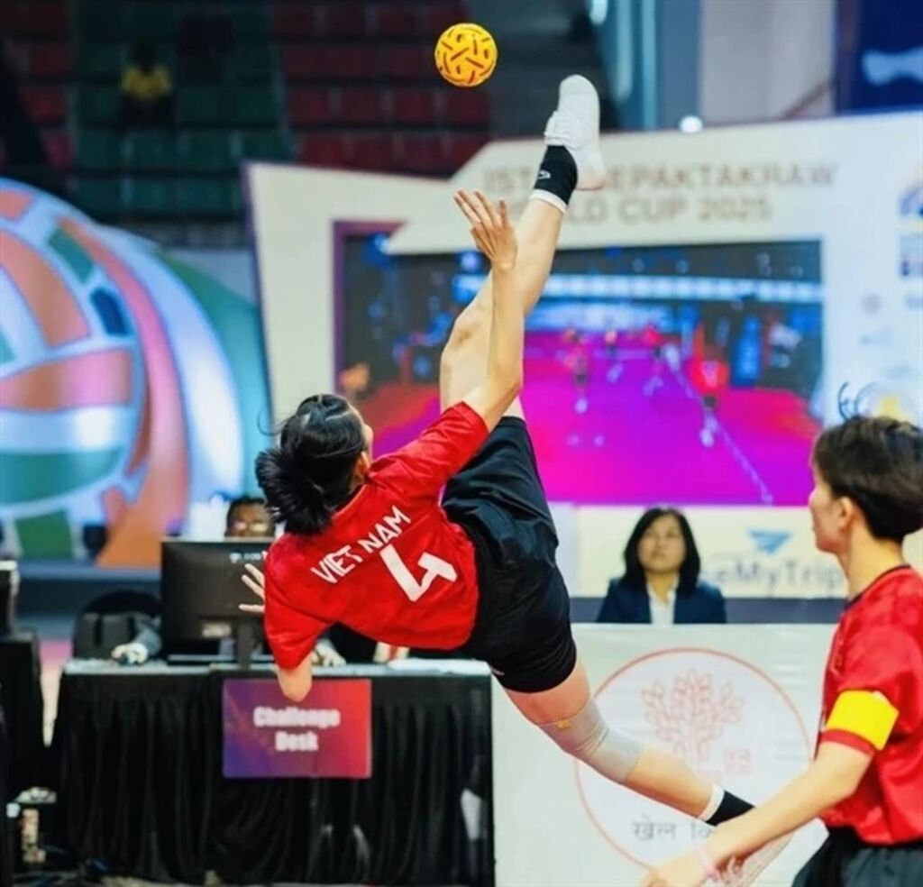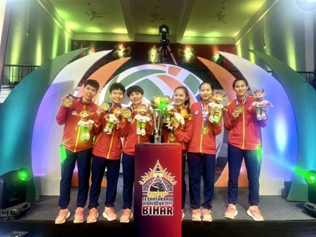 | Les joueuses vietnamiennes remportent la médaille d’or de la Coupe du monde de sepak takraw dans la catégorie quadrant féminin le 21 mars en Inde. |
