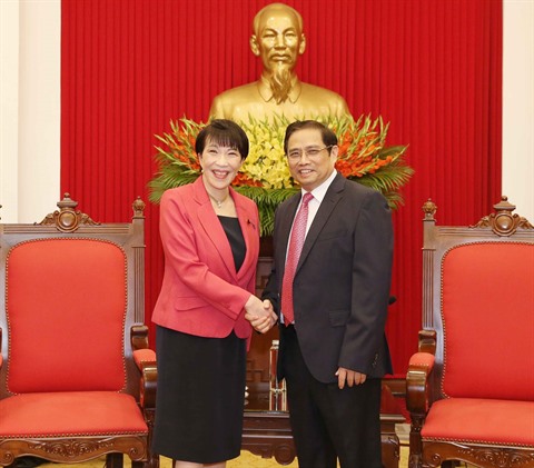 | Le chef de la Commission centrale de l'organisation du Parti communiste du Vietnam, Pham Minh Chinh, et la ministre japonaise des Affaires intérieures et des Communications, Takaichi Sanae, le 8 janvier à Hanoï. |