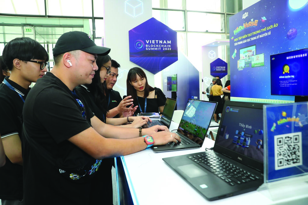 | Des visiteurs expérimentent des produits de blockchainlors d’une expositionen marge du sommet de la blockchain du Vietnam 2022. |