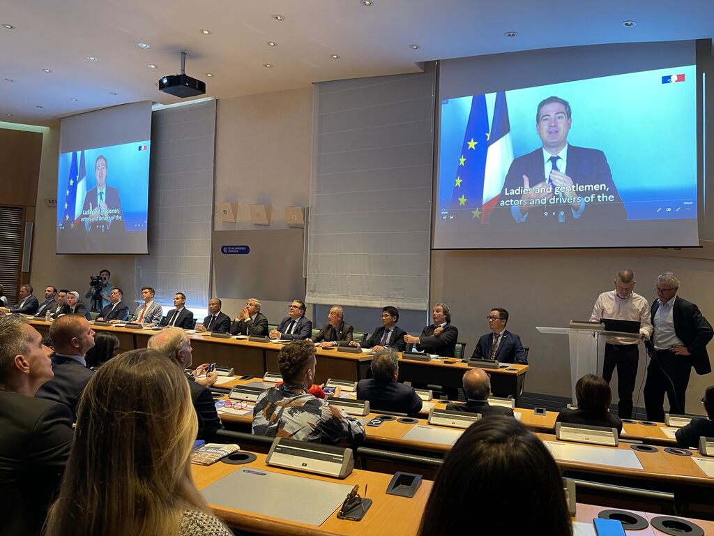 | Olivier Becht, ministre délégué auprès de la ministre de l’Europe et des Affaires étrangères, chargé du commerce extérieur, de l’attractivité et des Français de l’étranger, s'exprime par vidéo. |