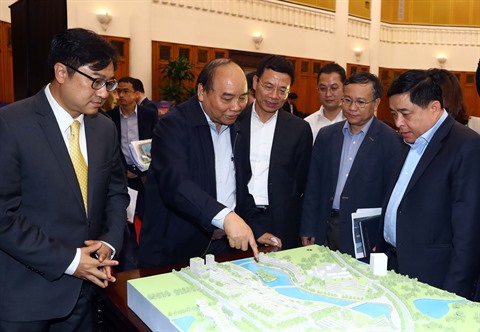 | Le Premier ministre Nguyên Xuân Phuc (2e, gauche) inspecte le modèle de centre national d’innovation du Vietnam. |