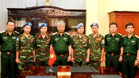 | Le général de corps d'armée Nguyên Chi Vinh (4e à gauche) prend la photo de souvenir avec les officiers s’apprêtant à servir la Mission de maintien de la paix de l'ONU, en juillet dernier. |