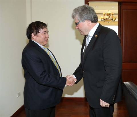 | Le président du Conseil des États de la Confédération suisse, Ivo Bischofberger (gauche), et le vice-ministre de l'Éducation et de la Formation, Bùi Van Ga, le 30 mars à Hanoï. |