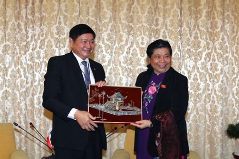 | La vice-présidente de l'Assemblée nationale vietnamienne, Tong Thi Phong, et le vice-président de l'Assemblée nationale législative de Thaïlande, Peerasak Porjit, le 11 mai à Hô Chi Minh-Villes. |