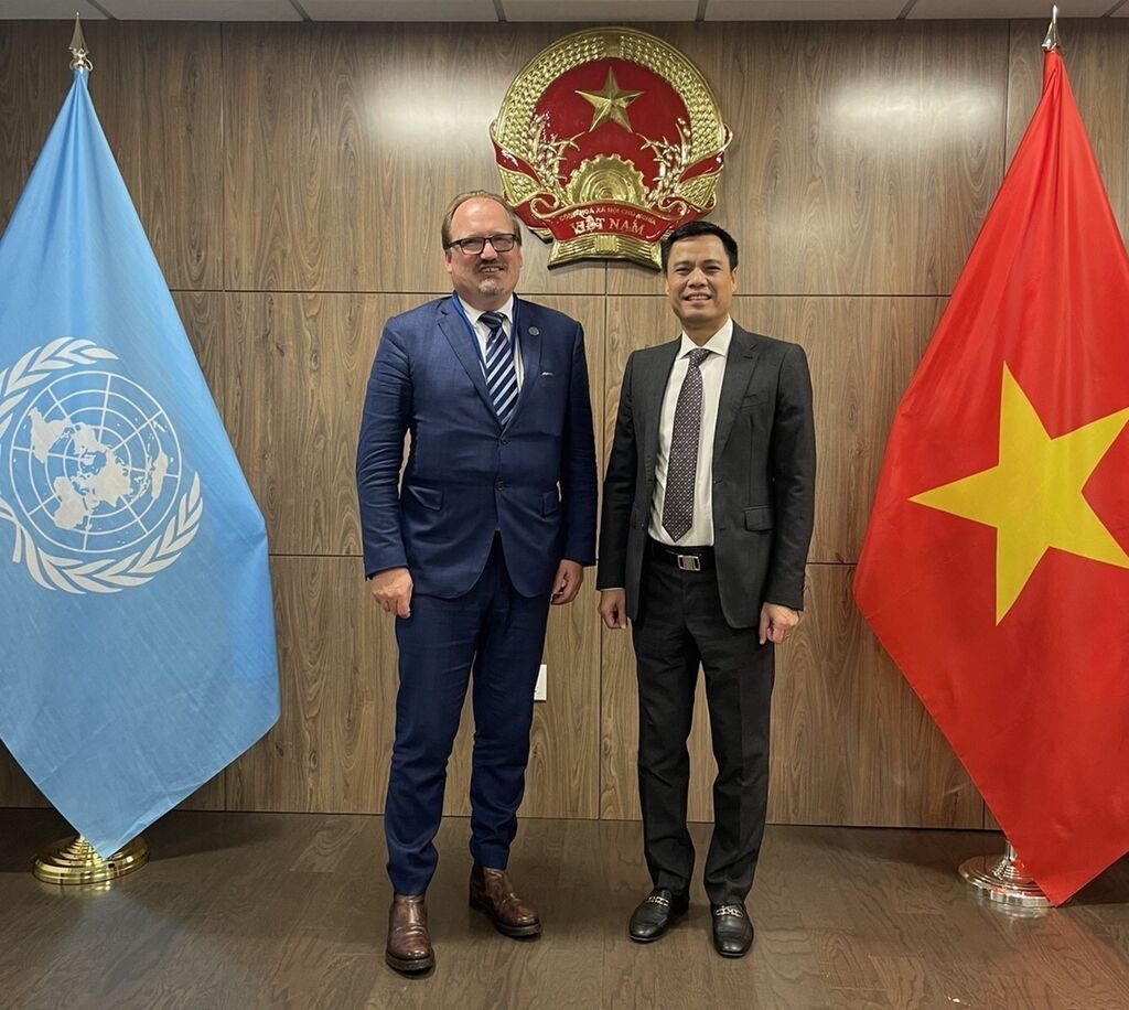 | L'ambassadeur Dang Hoàng Giang (droite), chef de la Mission permanente du Vietnam auprès de l'ONU, et Andreas Schaal, représentant spécial par intérim de l'OCDE auprès de l'ONU, le 27 septembre à New York, aux États-Unis. |