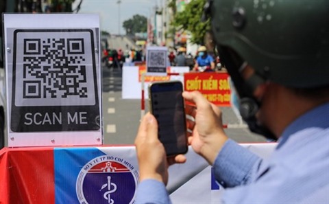 | Des gens scannent le code QR pour obtenir une déclaration médicale électronique lorsqu'ils passent le point de contrôle du COVID-19 à Hô Chi Minh-Ville, en juin 2021. |