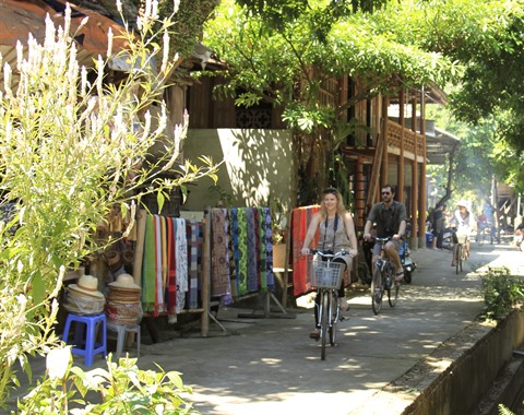 | Des touristes étrangers dans le village Lac à Mai Châu, province de Hòa Binh (Nord). |