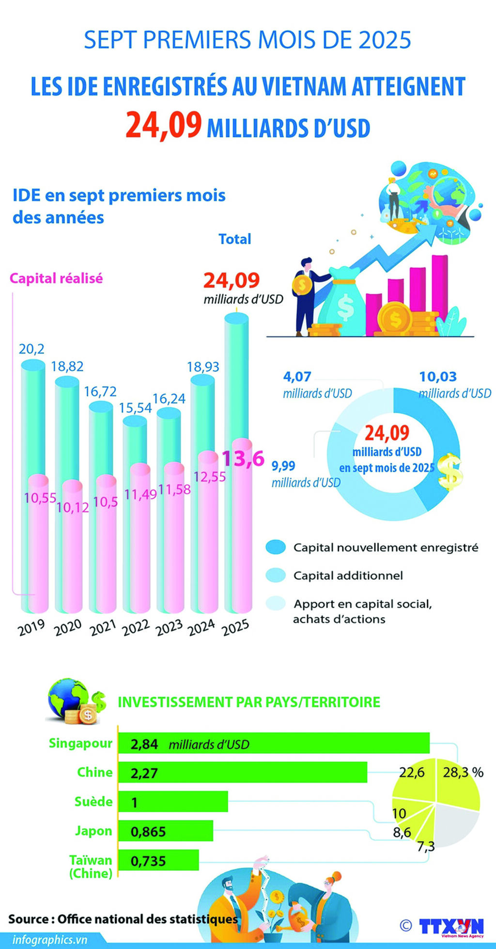 Le pays a attiré 24,09 milliards de dollars d’investissements directs étrangers (IDE) au cours des sept premiers mois de 2025, soit une hausse de 27,3% en glissement annuel, selon les données de l’Office national des statistiques du ministère des Finances. Les IDE décaissés se sont élevés à 13,6 milliards de dollars, en hausse de 8,4% en variation annuelle, un record sur cinq ans. Cette année, le pays vise 40 milliards de dollars d’IDE enregistrés et table sur un décaissement de 24 milliards.