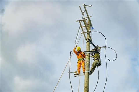 | Deux ouvriers réparent un réseau électrique dans la ville de Diên Biên Phu (Nord). |