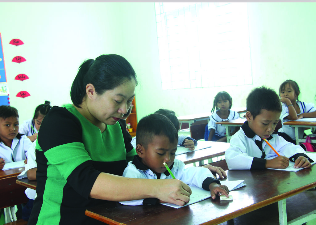 | L’institutrice Vo Thi Minh Thu aide ses élèves à tracer les lettres. |