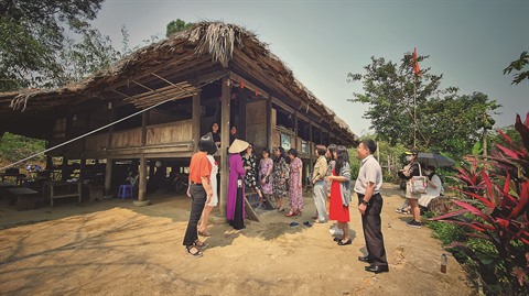 | Touristes visitant le Village culturel et touristique des ethnies du Vietnam à Hanoï. |