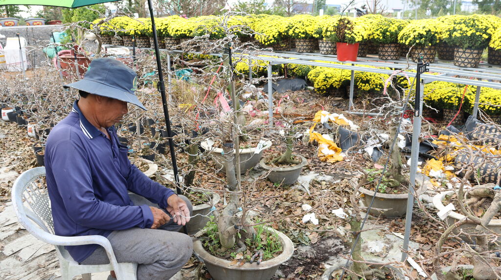 | L'horticulteur Huu Duc enfile des files métalliques pour façonner des abricotiers sous forme de bonsaïs. |