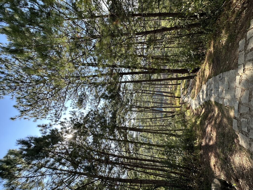 | La piste menant au village de Cu Lân, ombragée par les rangées de pins. |