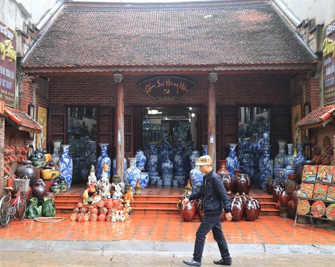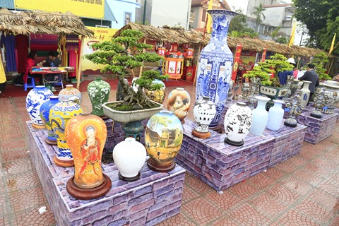 | Exposition des produits exemplaires des artisans talentueux de Bat Tràng à côté de la maison commune. |