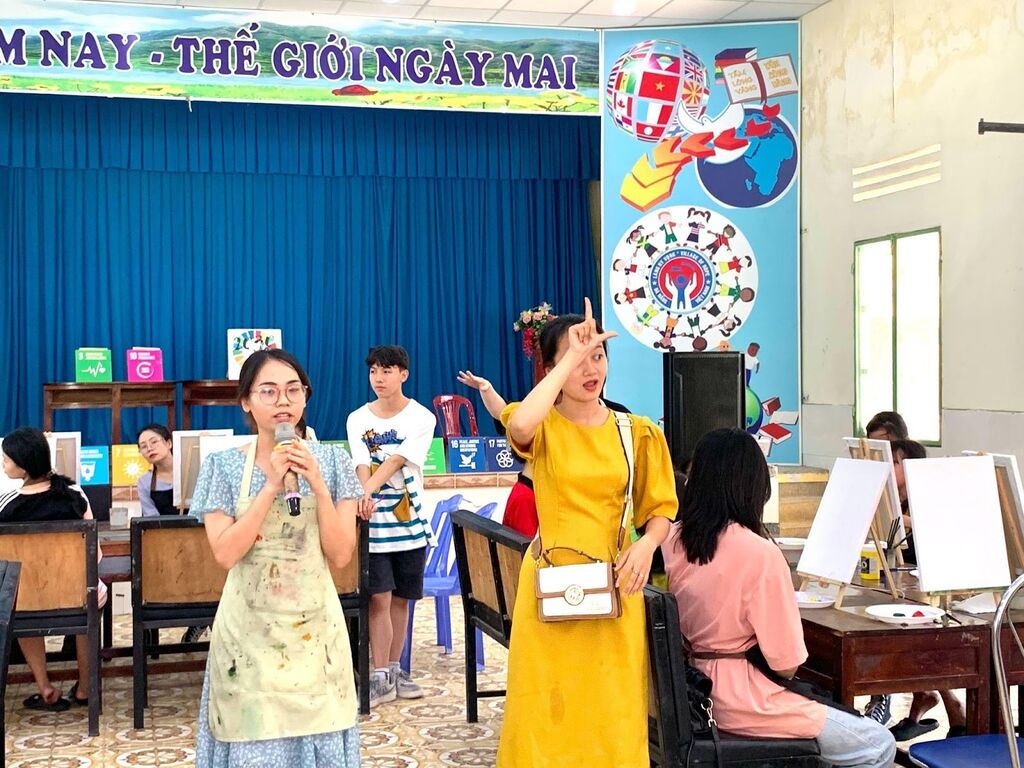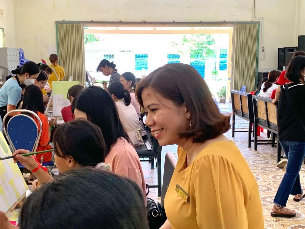 | Mme Thảo avec ses étudiants au cours de peinture. |