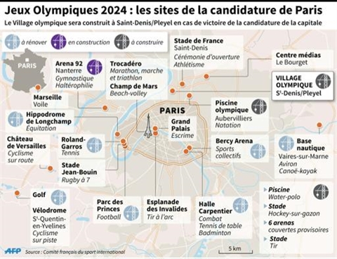 | Carte de localisation des différents site de la candidature de Paris pour les JO-2024. |