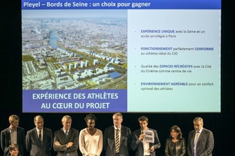 | Annonce du choix du site de Saint-Denis/Pleyel pour accueillir le Village olympique en cas de victoire de la candidature de Paris aux JO-2024, le 5 novembre au Stade de France. |